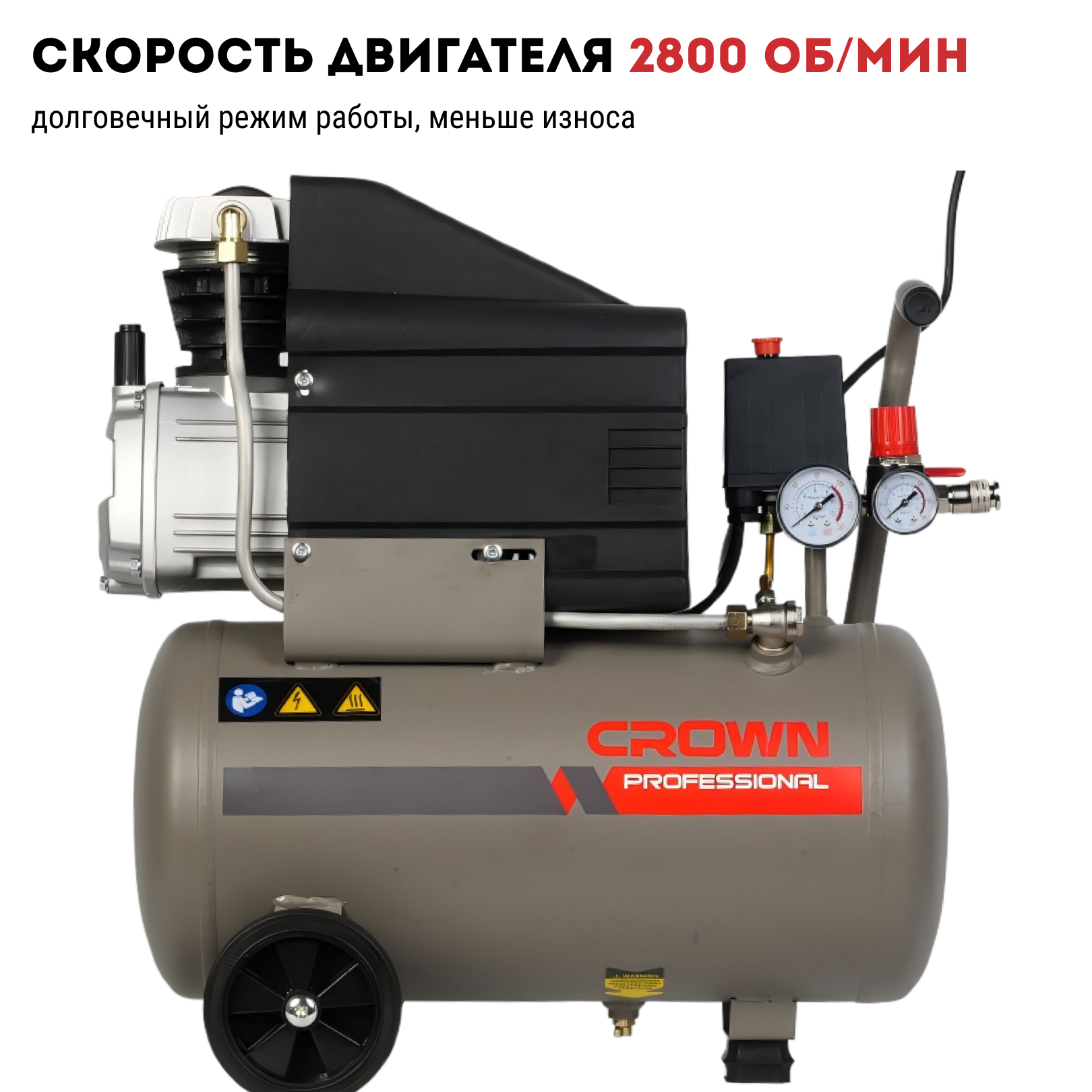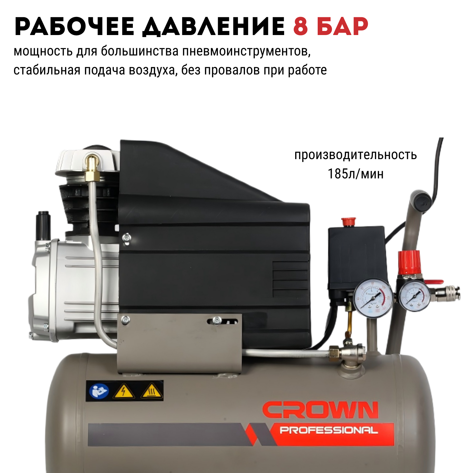 Компрессор воздушный CROWN CT36084, 2,5HP, 24л, 2800 об/мин, 220В/50Гц, 185Л/мин, 8 Бар