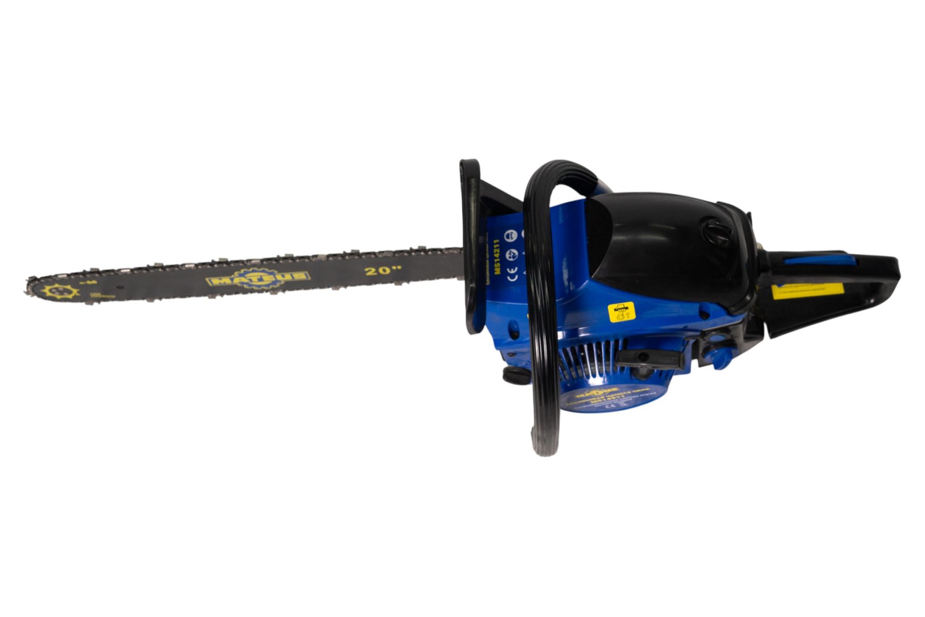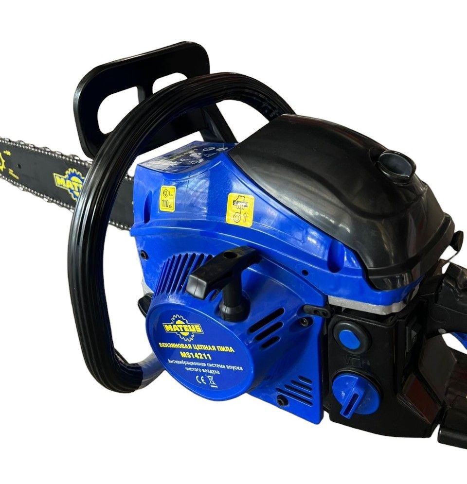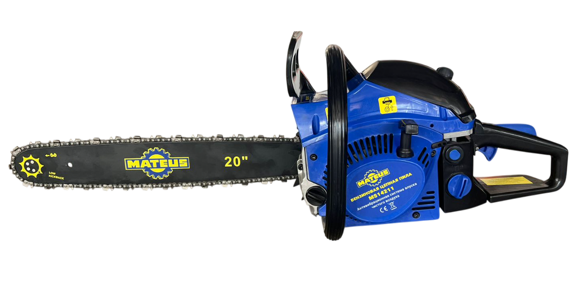 Пила цепная бензиновая Mateus MS14211 Двухтактный двигатель с воздушным охлаждением Антивибрационная система впуска чистого воздуха Объем двигателя 58 см3 Скорость на холостом ходу 3000 об/мин±200 Максимальная скорость 10500 об/мин±500 Номинальная выходная мощность 2400Вт/3.2л.с. Емкость топливного бака 550 мл Емкость масляного бака двигателя 260 мл Топливоподкачивающий клапан «праймер» Длина полотна 20 дюймов/50,8 см Толщина цепи 1,5мм Количество звеньев цепи 76шт Звездочка (зубья х шаг): 7Т х 0,325 Сухой вес при пустых баках 5,4 кг