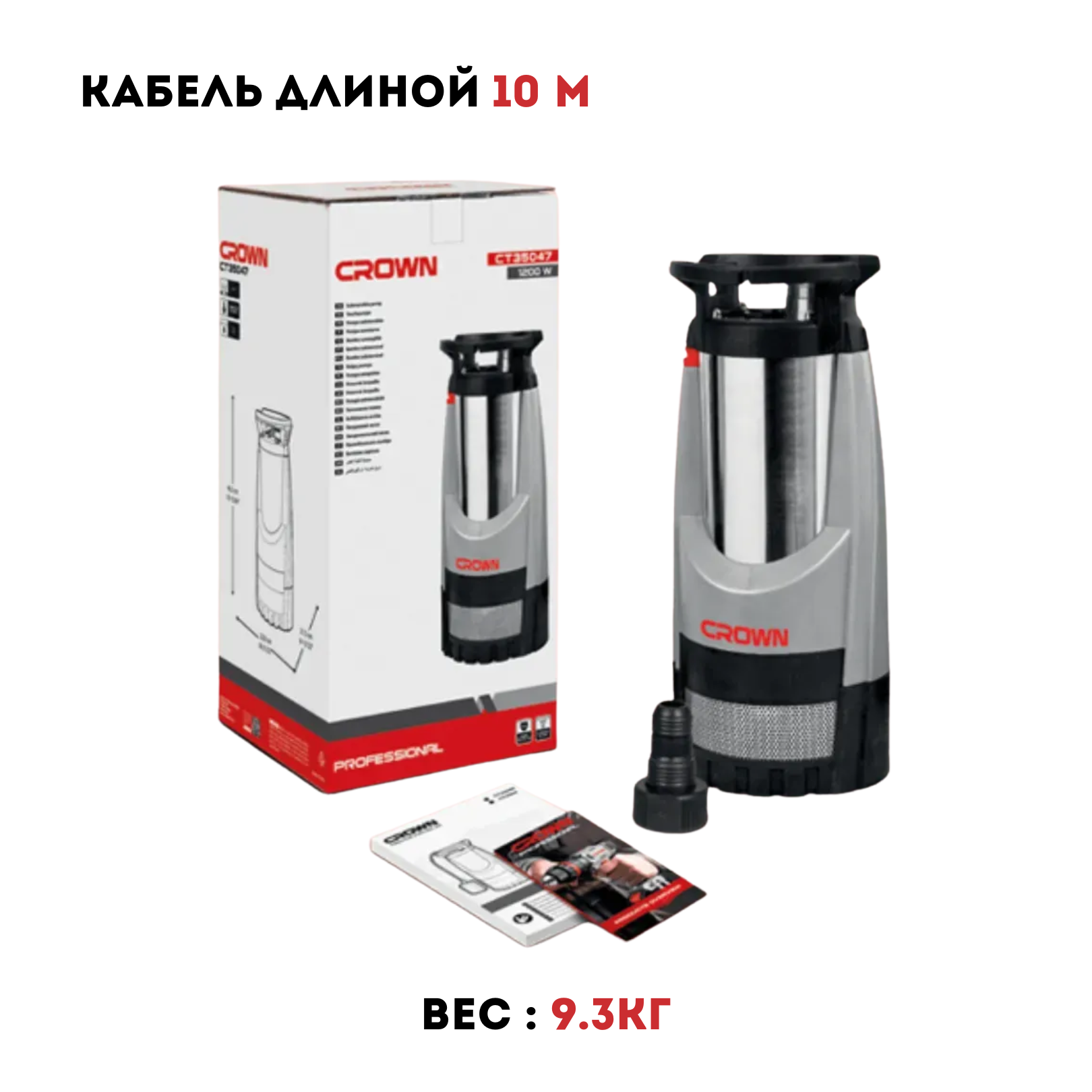 Погружной насос CROWN CT35047 (Акция 24), 1200Вт, макс.производительность 6.5 м?/ч, макс.высота подъема 44м, макс.глубина погружения 7м, 9.3кг
