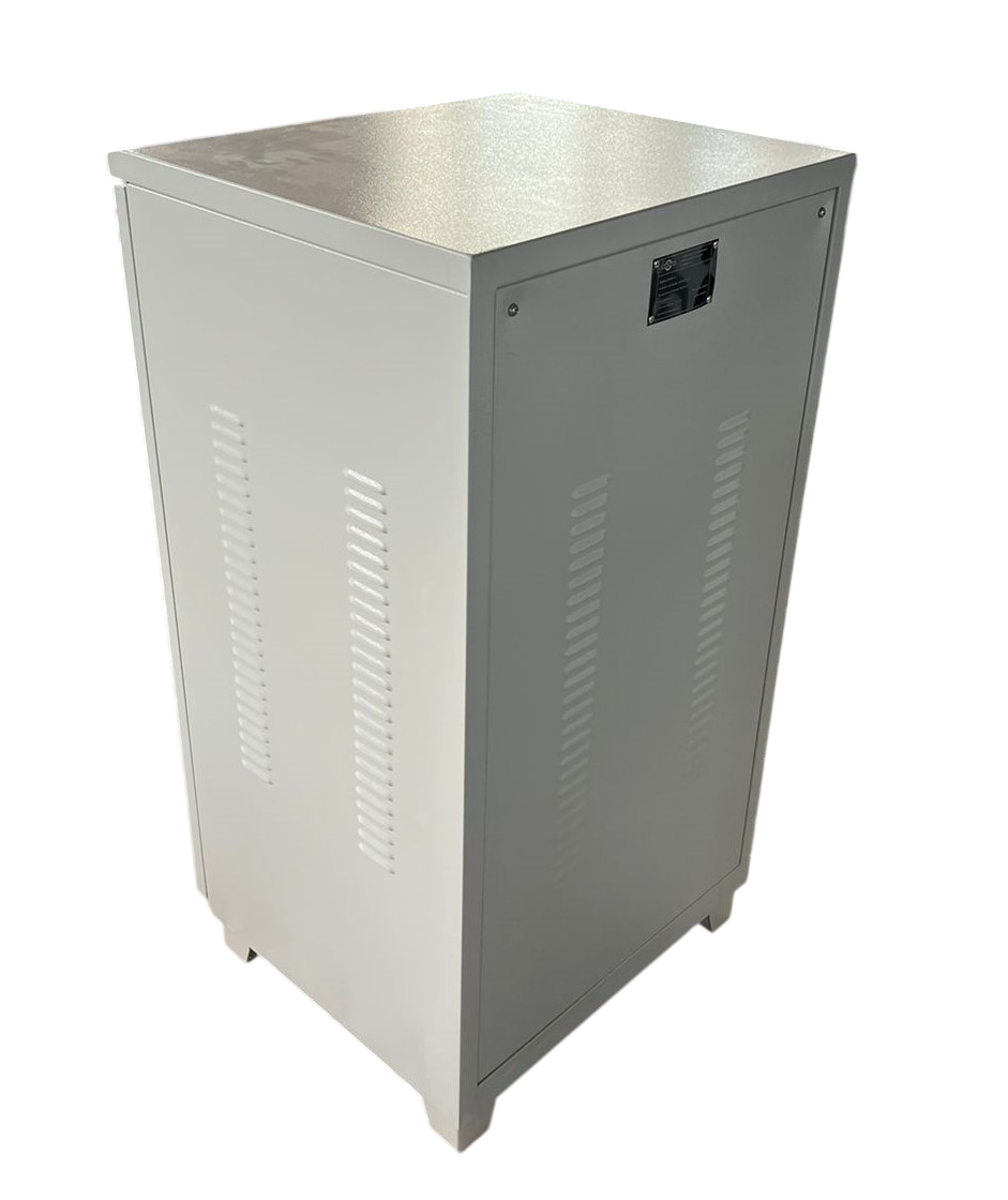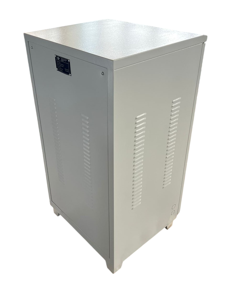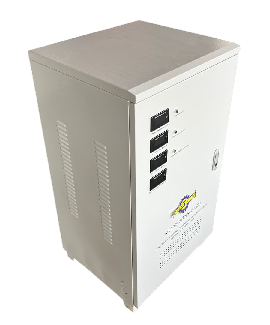 Эта напольная трехфазная модель надежно защищает энергозависимое оборудование от нестабильного электропитания, обеспечивая стабильную работу даже в сложных условиях сети. Состоит из сервопривода (электродвигателя), автотрансформатора и управляющего микропроцессора.